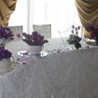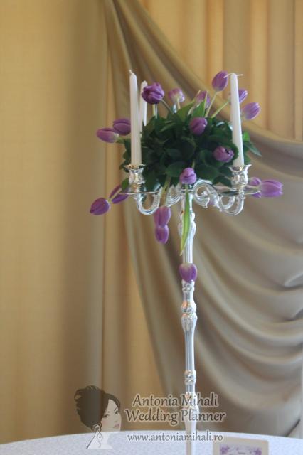 O nunta rafinata, cu sfesnice, aranjamente cu lalele mov, huse elastice si dantela alba.